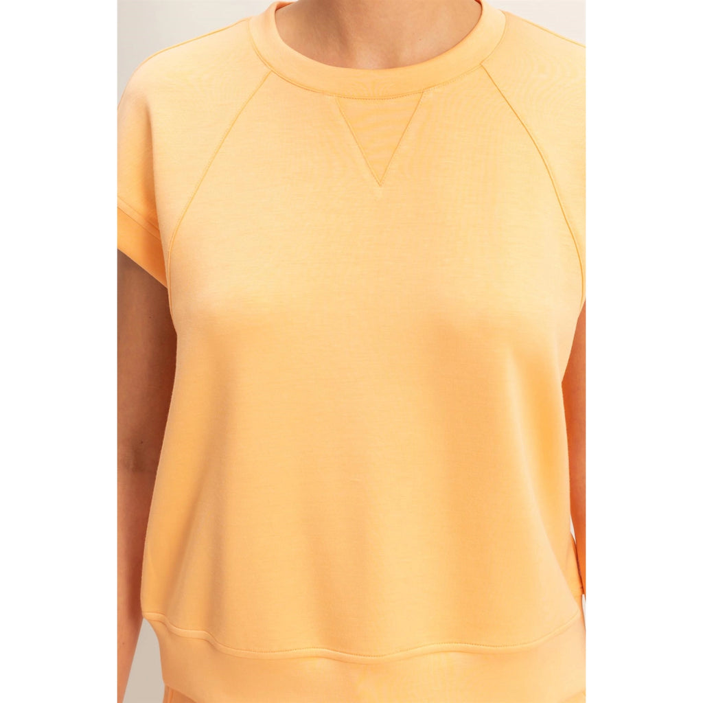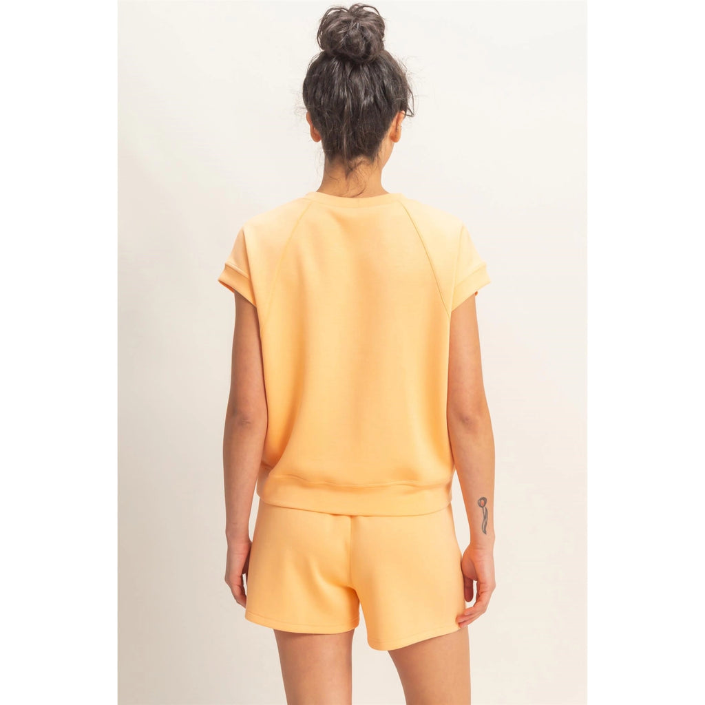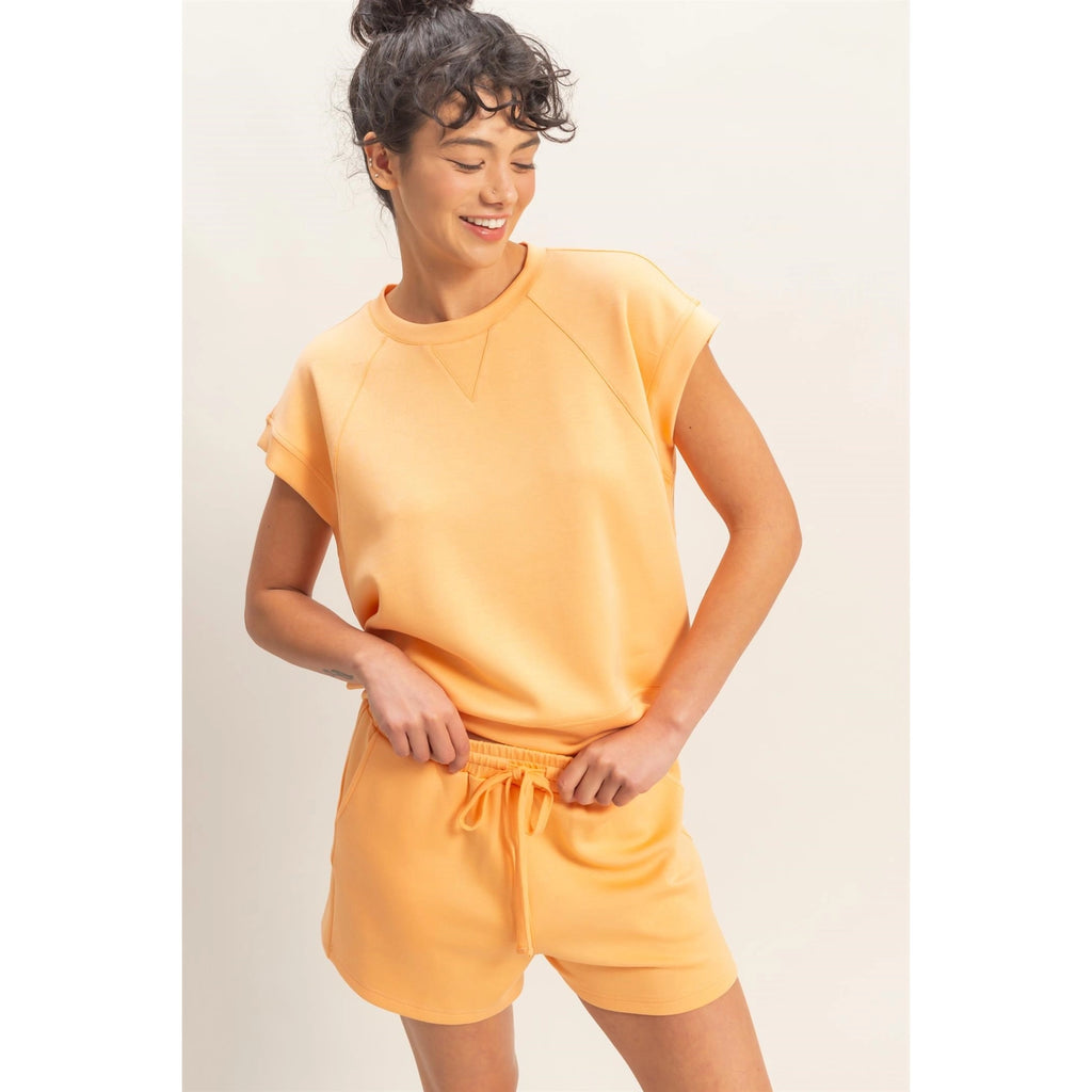 Embrace leisure in this soft two-piece set, defined by casual ease. The top highlights a self-fabric crew neckline with a V-stitch insert and short raglan sleeves. Matching shorts feature an elastic waistband with a drawstring tie and side pockets. Cut in a relaxed fit, pair with sneakers for a chic, laid-back aesthetic.