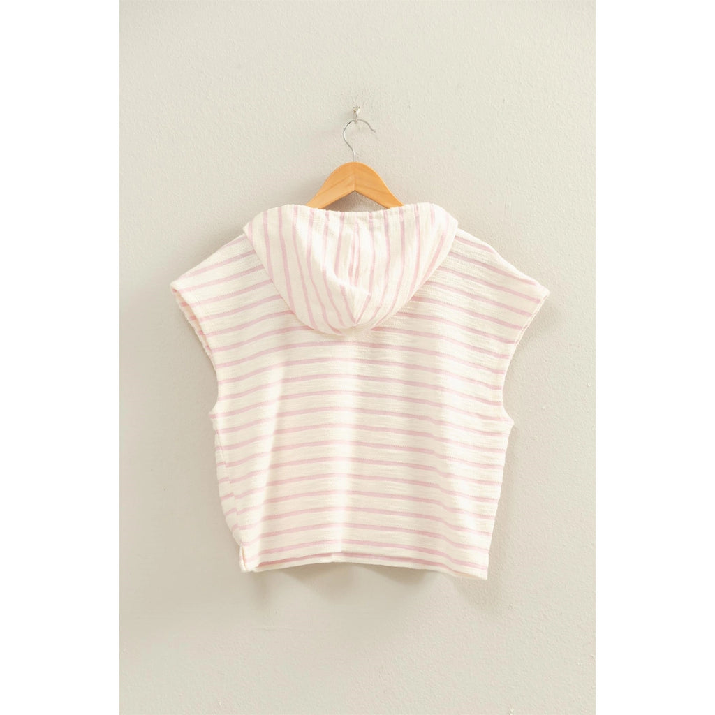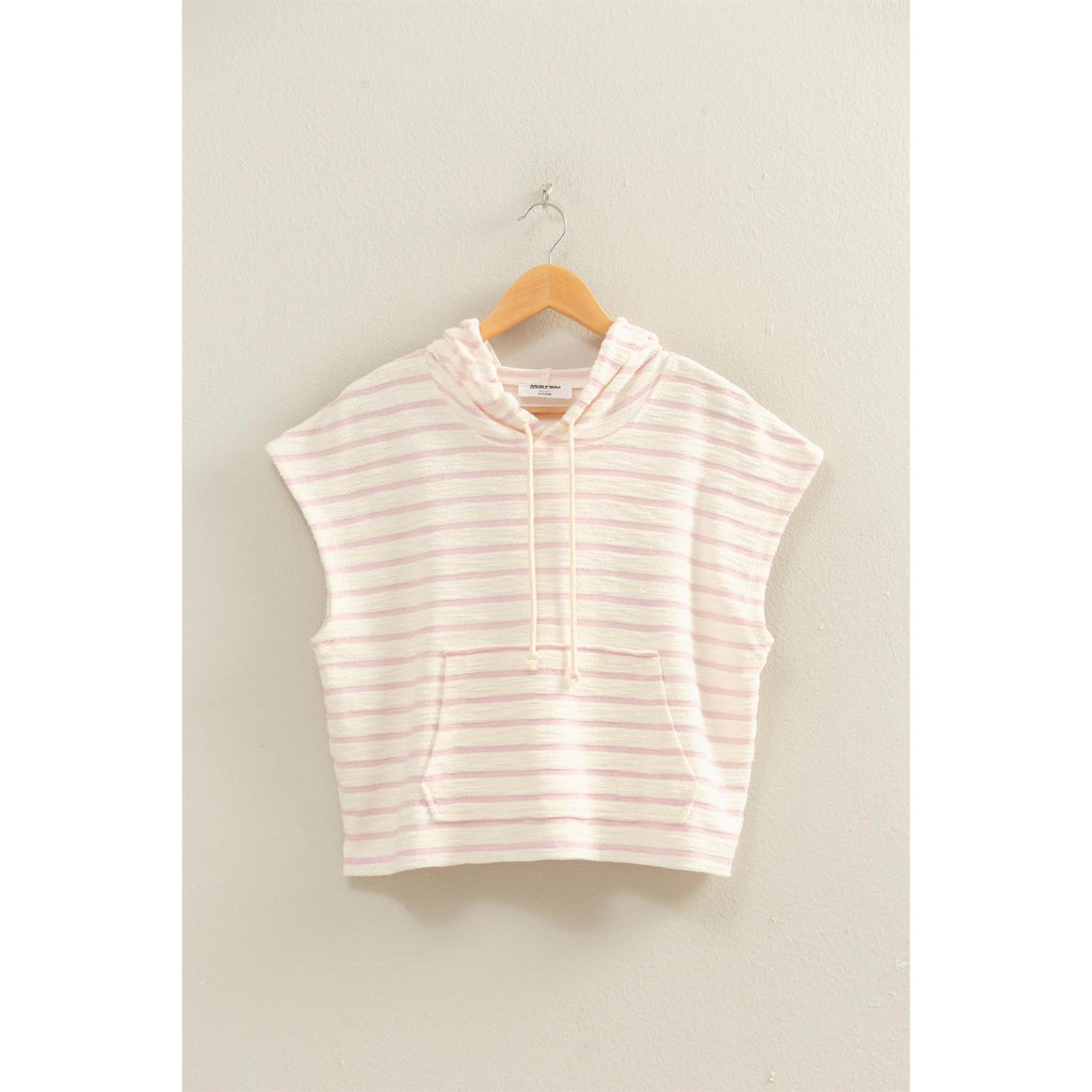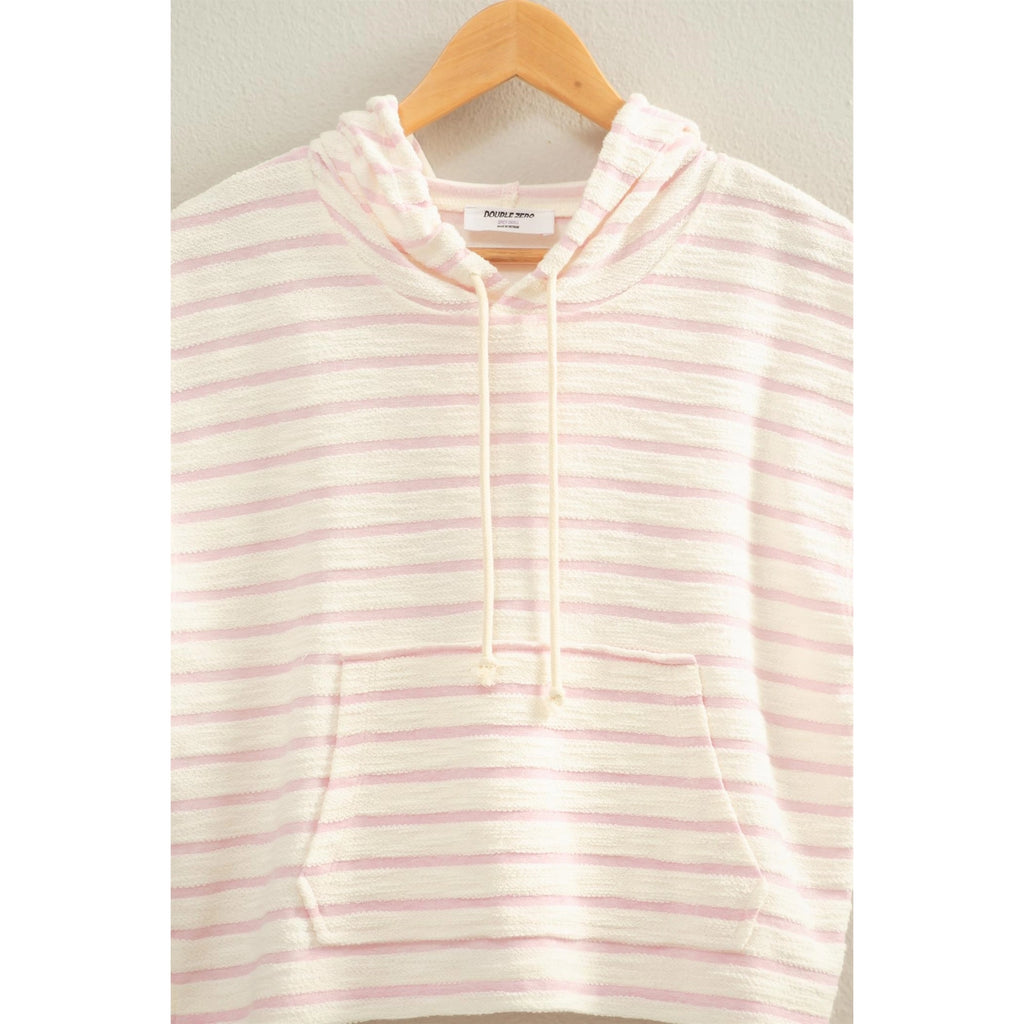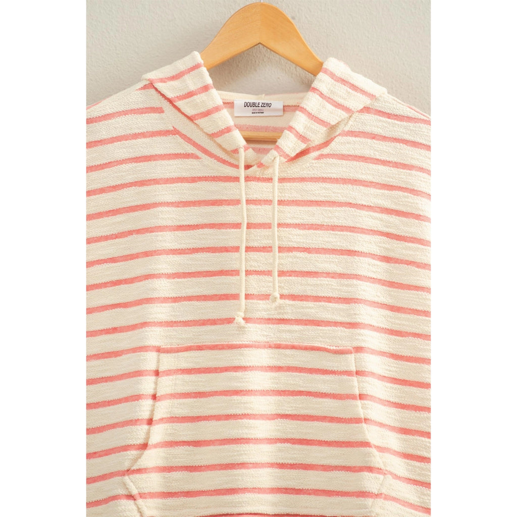 Breezy summer nights call for this casual hoodie. Decorated with a striped pattern, this hoodie has short sleeves and an attached hood with drawstring detailing. The hoodie offers a relaxed fit and features a kangaroo pocket.