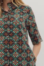 Geometric print short sleeve midi dress featuring button closure at front. Side pockets. Lined. Woven. Non-sheer. Lightweight.