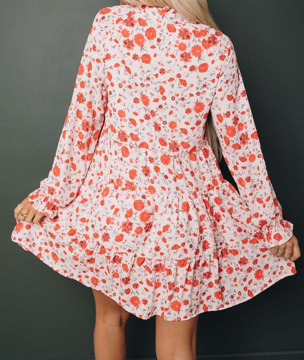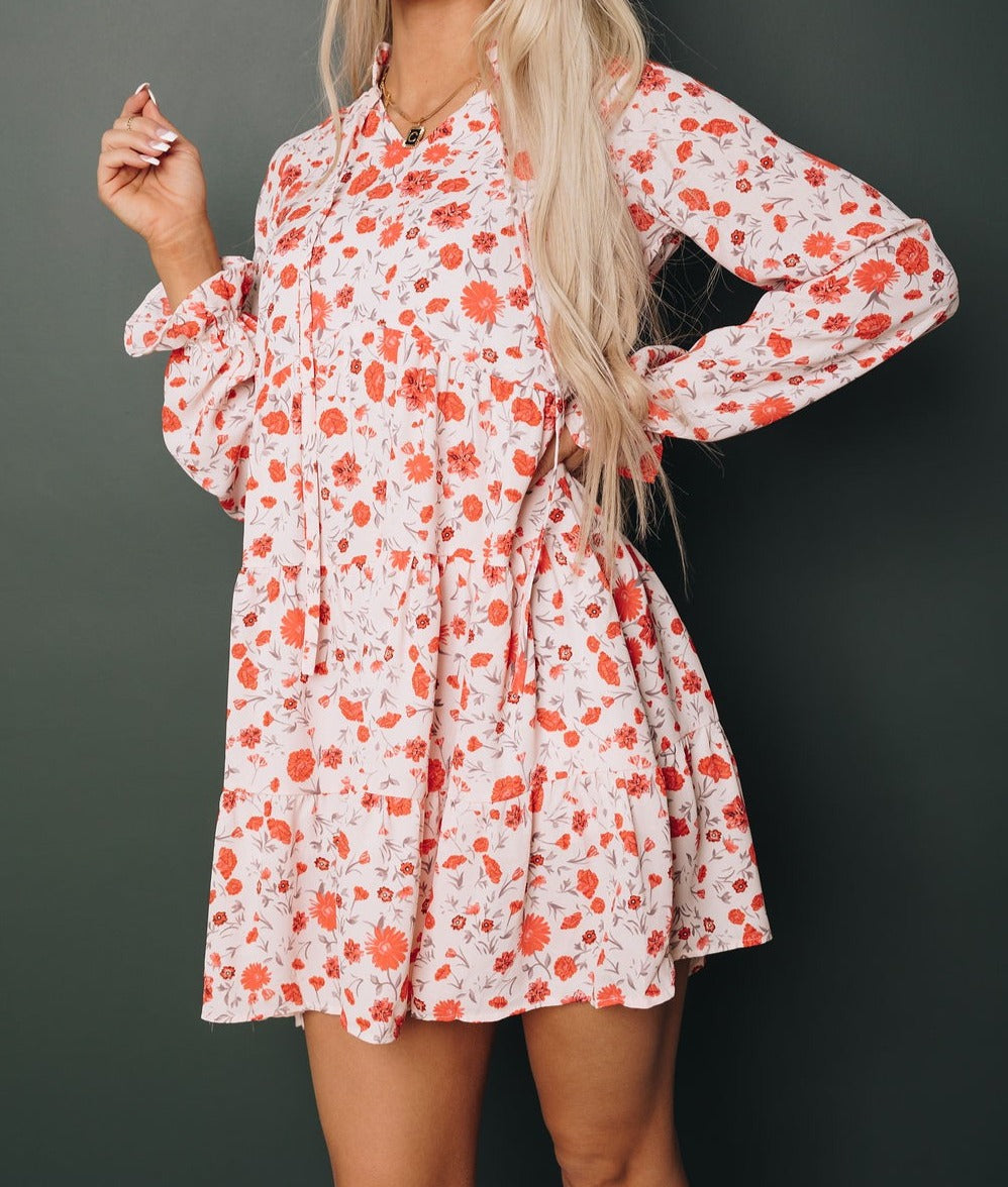 Drawstring Floral Print Baby Doll Dress w/ a Long Sleeve