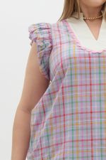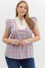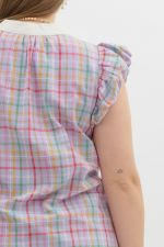 Multicolor checkered pattern voluminous ruffle over shoulder pullover top featuring contrasting bib accented with scallop trim detail. Unlined. Woven. Non-sheer. Lightweight.