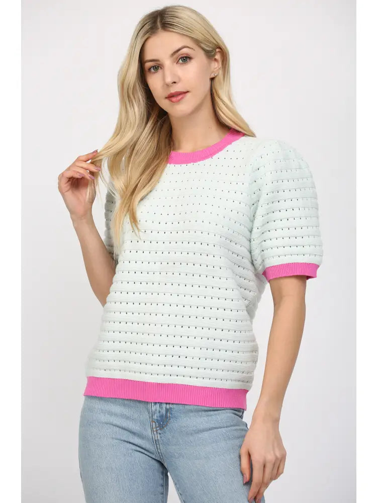 Short puff sleeve cropped sweater top with contrast band