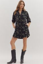 Floral print half sleeve mini dress featuring button closure at front. Side pockets. Unlined. Woven. Non-sheer. Lightweight.