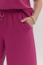 Bottom: Textured solid high waisted wide leg pants featuring elastic and self tie at waist. Pocket at sides. Asymmetrical hem. Unlined. Knit. Non-sheer. Medium weight.