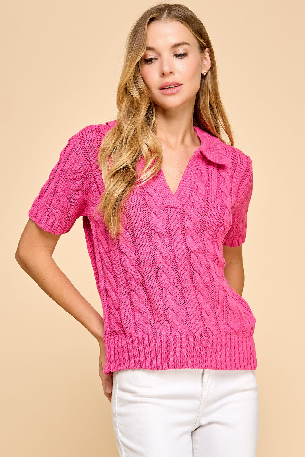 Pink collared, short sleeve cable knit sweater.