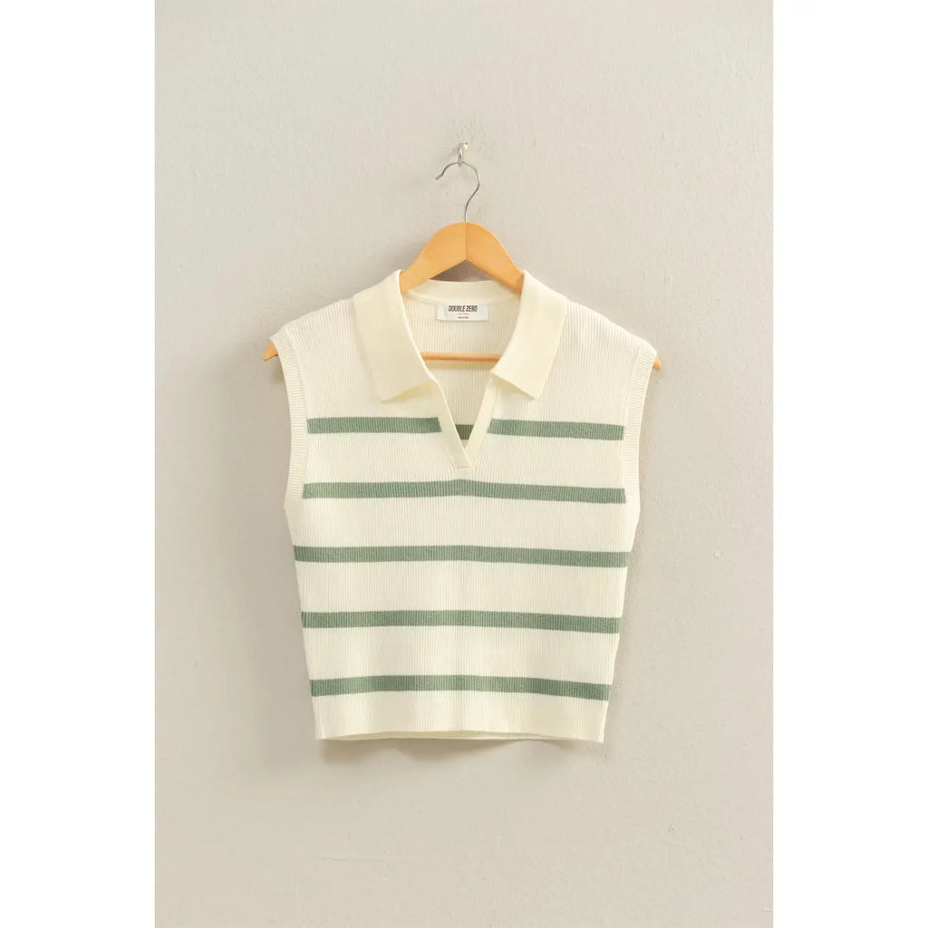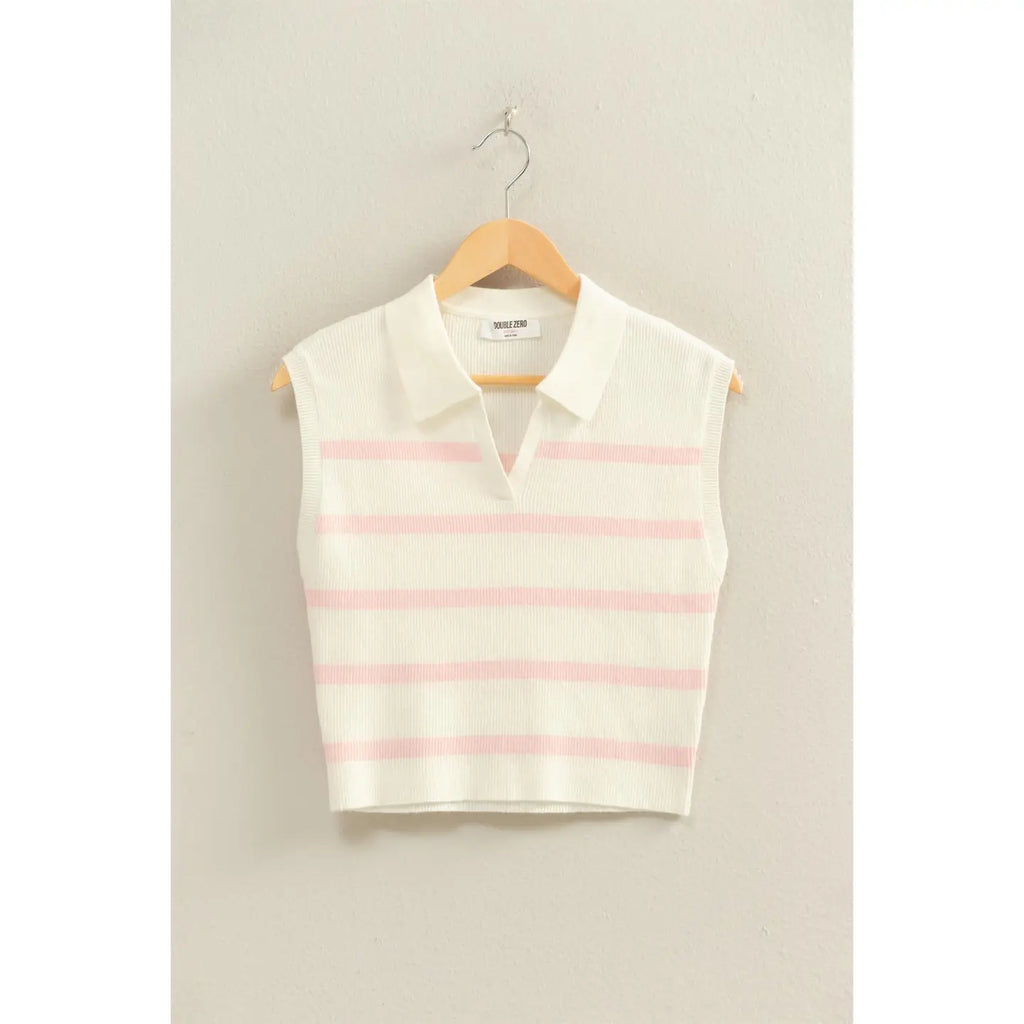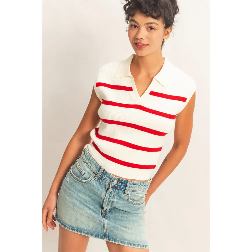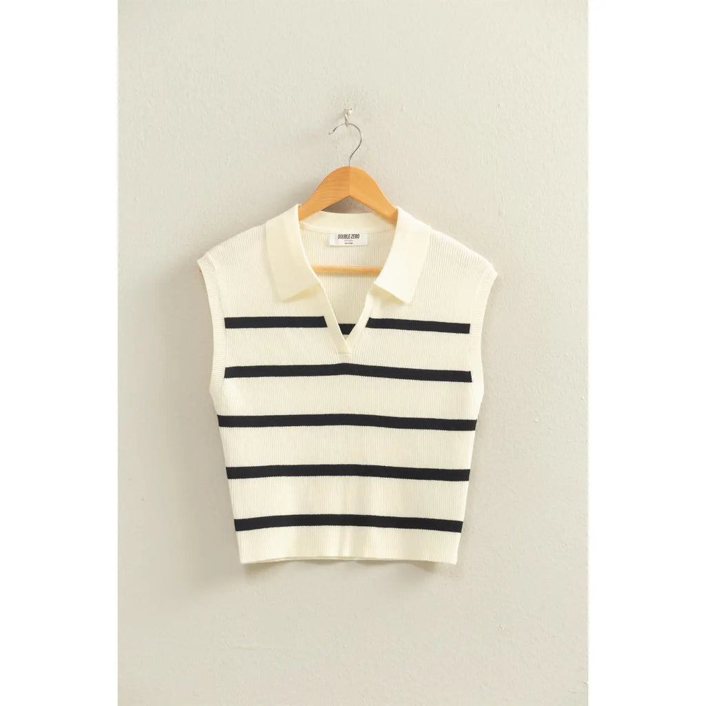 This is your go to polo vest for a super chic wardrobe. Sure to add a feminine charm, this striped vest is styled with a point collar and a fitted bodice that skims your curves beautifully. Cropped length makes it perfect to pair with high rise bottoms.