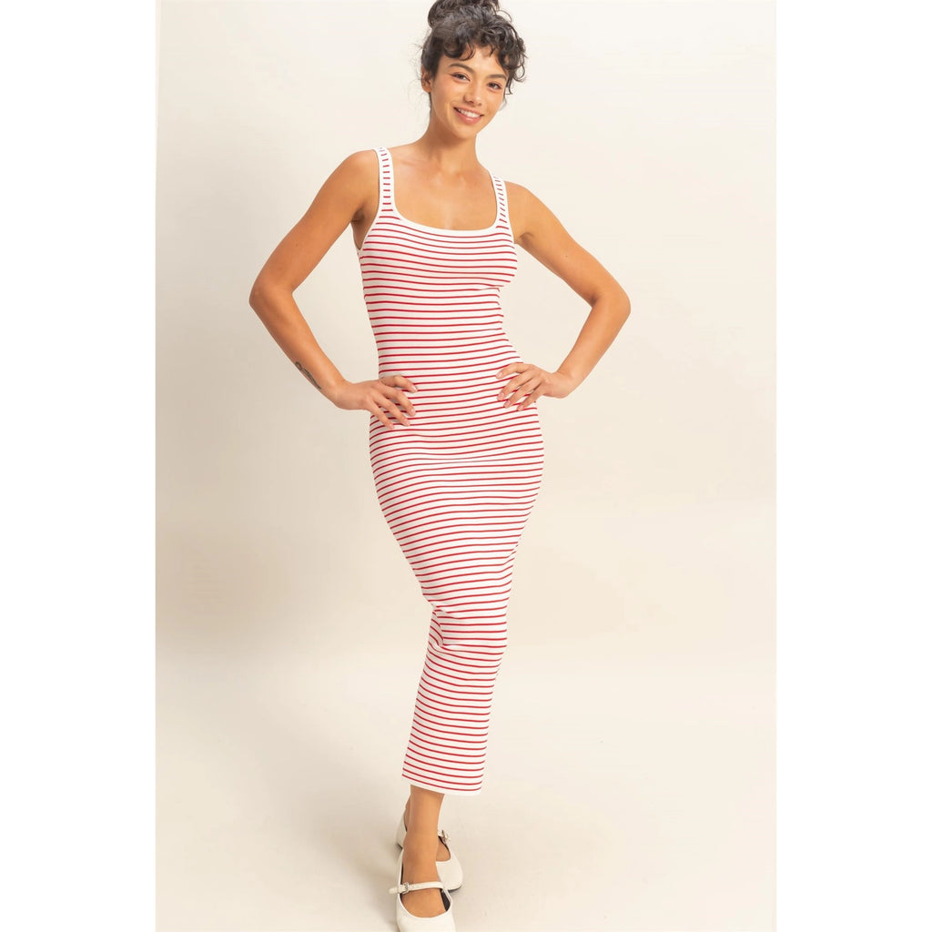 Define your style with this form-fitting knit dress, showcasing a bold horizontal stripe pattern. It features a deep scoop neckline and thin shoulder straps for a feminine look. The sleek silhouette falls to a sophisticated maxi length, punctuated by a center back slit. Style with sandals for a polished, effortless daytime ensemble.