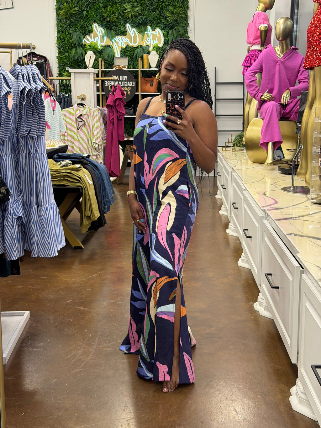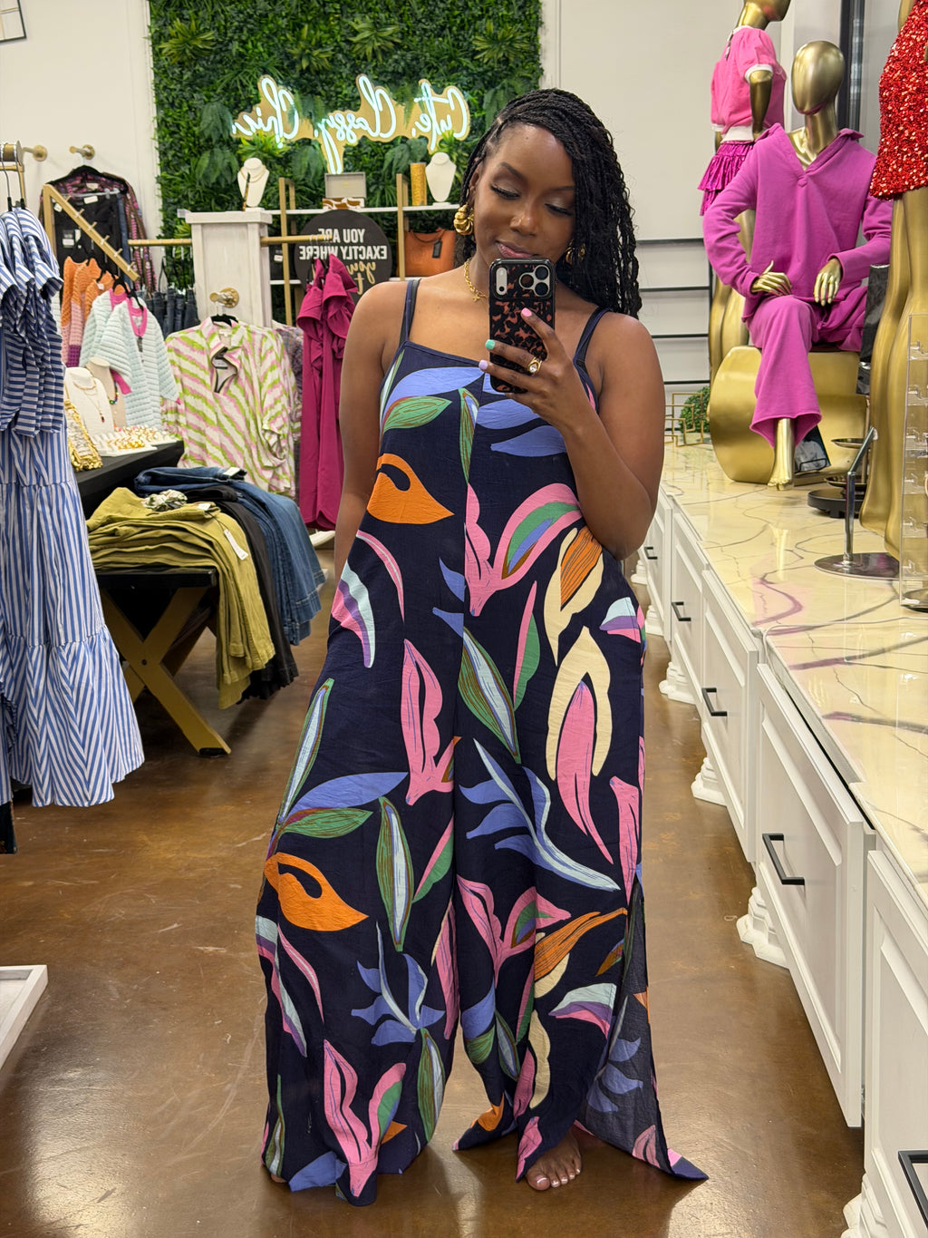 Printed Spaghetti Strap Wide Leg Jumpsuit.
